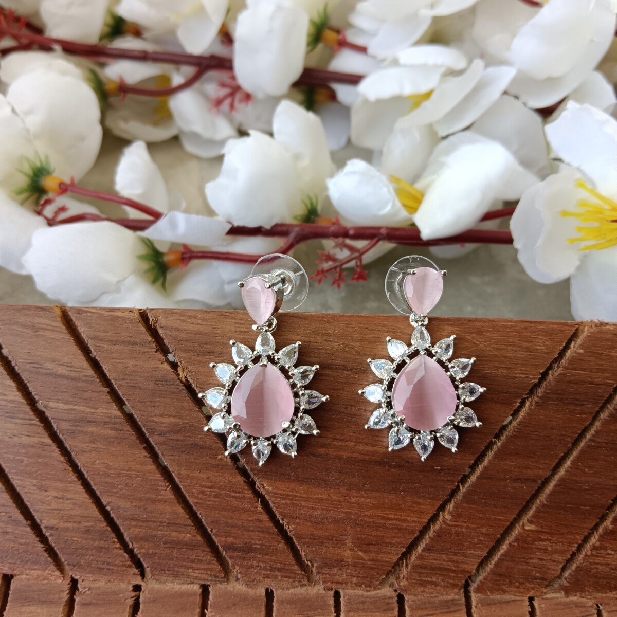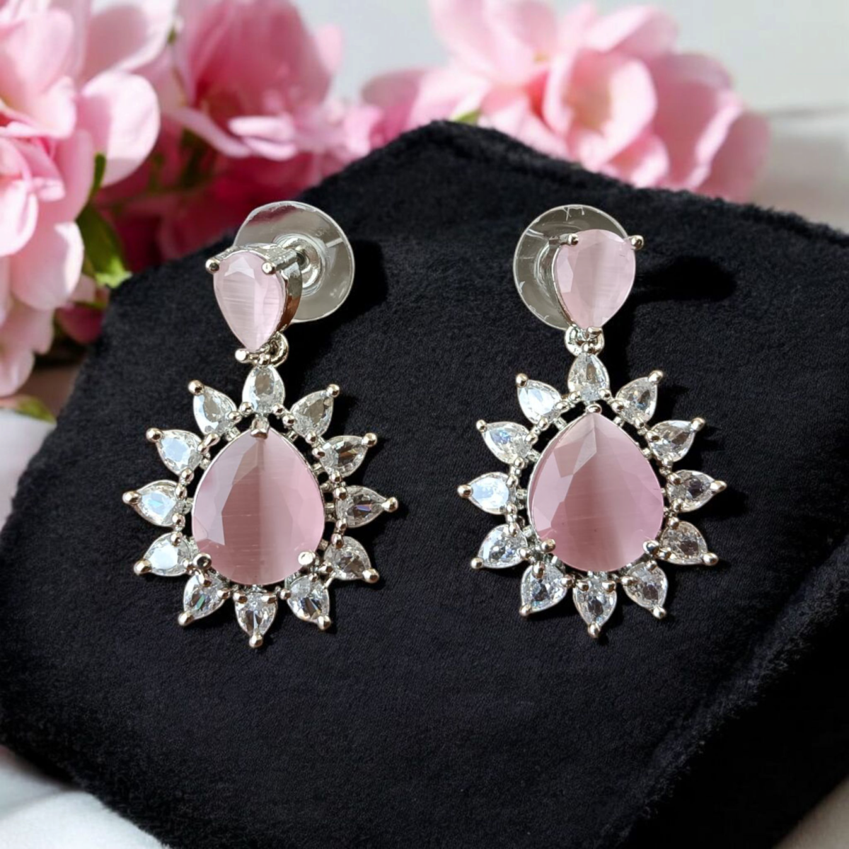 These exquisite earrings are a stunning blend of elegance and modern design, perfect for adding a touch of sophistication to any ensemble. Each earring features a captivating, pear-shaped, blush-pink gemstone as the centerpiece, radiating a soft, romantic glow. The gemstone is delicately encased in a halo of shimmering, meticulously placed, round-cut clear stones, enhancing its brilliance and creating a dazzling frame. The intricate details continue to the top of the earrings, where an ornate, flower-like arrangement of clear, sparkling stones adds a touch of glamour. These carefully crafted elements create a beautiful contrast with the warmth of the pink gemstone, offering a balanced and eye-catching design. The earrings are crafted from a high-quality, gleaming silver-toned metal, providing a luxurious base for the gemstones and ensuring lasting beauty. These earrings are an ideal accessory for both special occasions and everyday wear. Their refined design makes them versatile enough to complement a variety of outfits, from a formal evening gown to a casual chic ensemble. They’re a perfect gift for someone special or a treasured addition to your personal jewelry collection, exuding grace and refined beauty with every wear. They can be perfectly paired with a matching pendant or ring to complete a cohesive and elegant look.