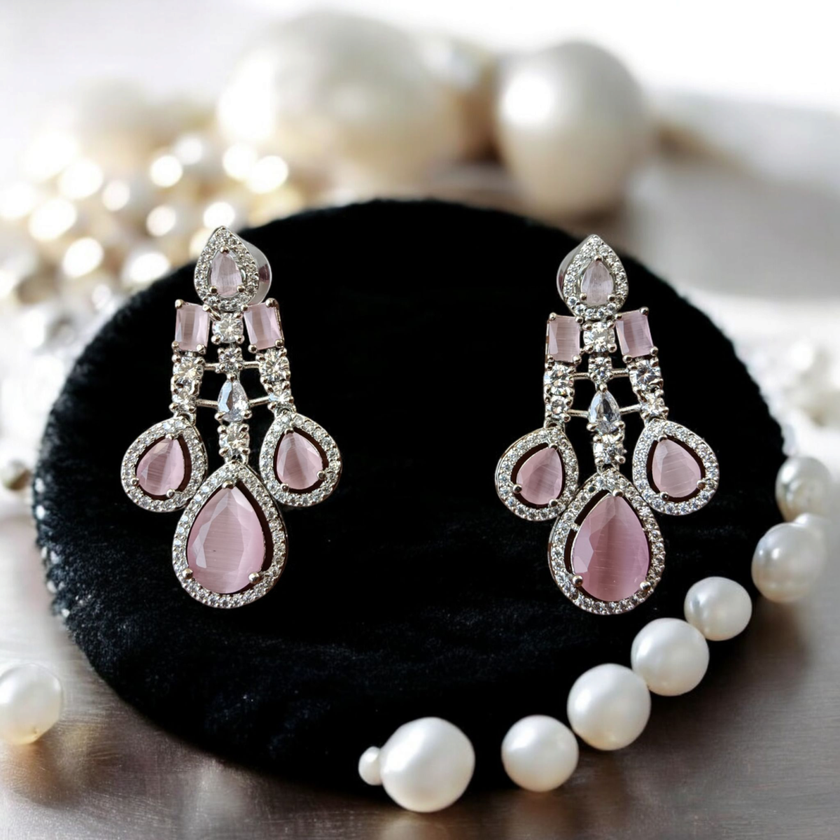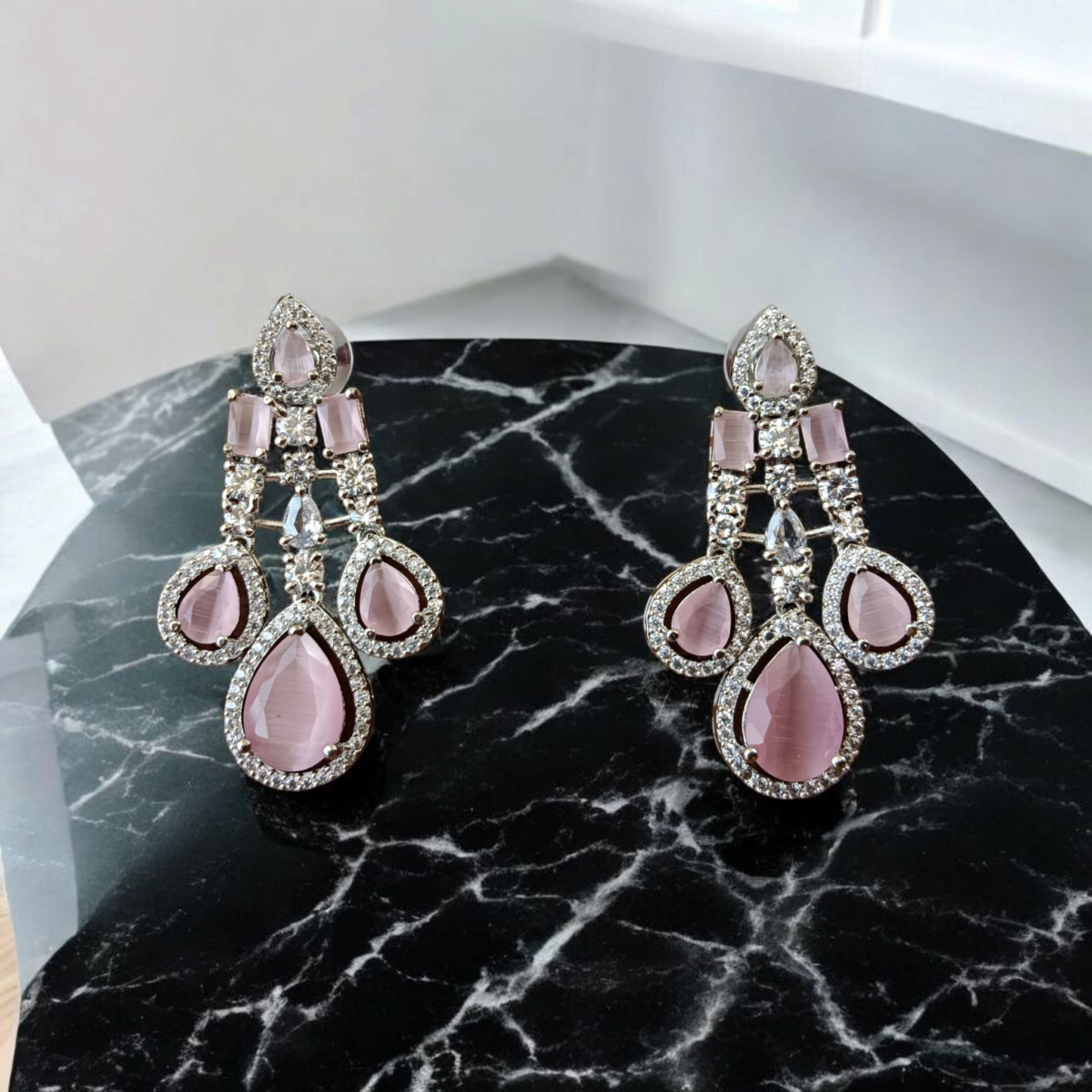 Step into a world of timeless elegance with these exquisite Pink Stone and American Diamond Chandelier Dangler Earrings, meticulously crafted to add a touch of glamour to your ensemble. Perfect for the modern woman who appreciates classic beauty with a contemporary twist, these earrings are designed to make a statement. Each earring boasts a stunning multi-tiered chandelier design, featuring captivating light pink stones that radiate a subtle, ethereal glow. These beautiful stones, possibly resembling cat’s eye or moonstone, are artfully cut in both elegant pear drop and sophisticated rectangular shapes, creating a dynamic visual appeal. Each vibrant pink stone is exquisitely framed by a halo of brilliant American Diamonds (AD stones), also known as Cubic Zirconia, ensuring maximum sparkle and fire.